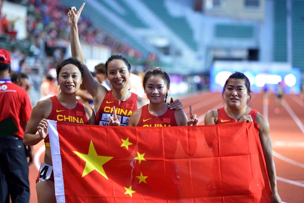 7月12日,中國隊(duì)選手葛曼棋、韋永麗、梁小靜和袁琦琦(從左至右)在女子4×100米接力決賽后合影。新華社發(fā)(拉亨攝)