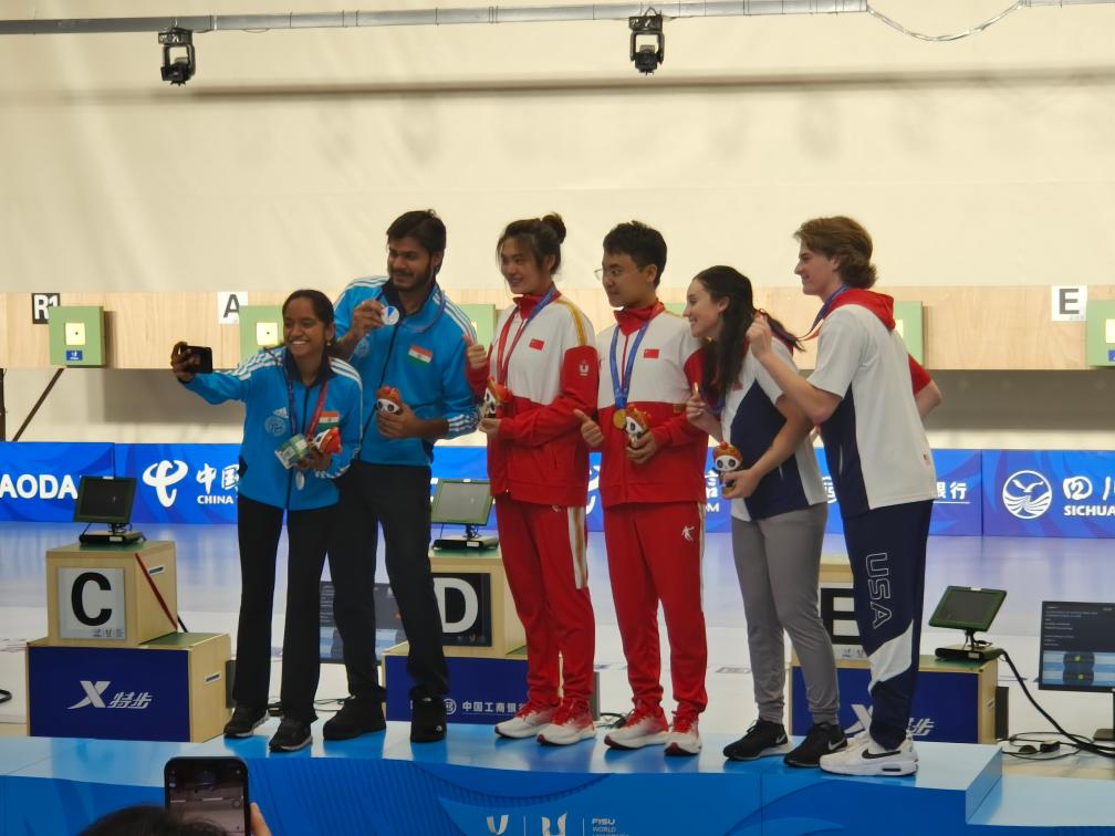 當(dāng)天,射擊賽場的頒獎(jiǎng)儀式現(xiàn)場變成了全場一起慶生的歡樂景象。在10米氣步槍混合團(tuán)體項(xiàng)目獲得銀牌的印度姑娘瓦拉里萬站在領(lǐng)獎(jiǎng)臺(tái)上,在“生日快樂”的祝福聲中,伴著現(xiàn)場觀眾的掌聲,與一同參加頒獎(jiǎng)儀式的中國、美國選手們拍照留念。