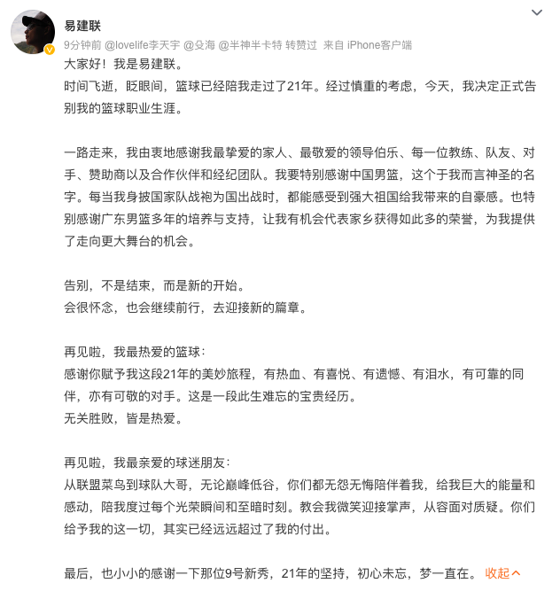 8月29日深夜,易建聯(lián)在個(gè)人自媒體上宣布正式告別籃球職業(yè)生涯。
