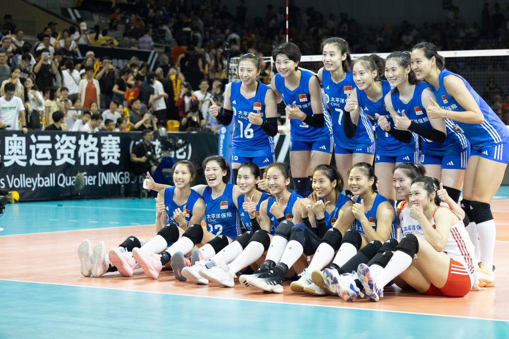 9月17日,中國(guó)隊(duì)球員在賽后合影。當(dāng)日,在浙江省寧波市舉行的巴黎奧運(yùn)會(huì)女排資格賽A組比賽中,中國(guó)隊(duì)以3:0戰(zhàn)勝墨西哥隊(duì)。新華社記者 張濤 攝
