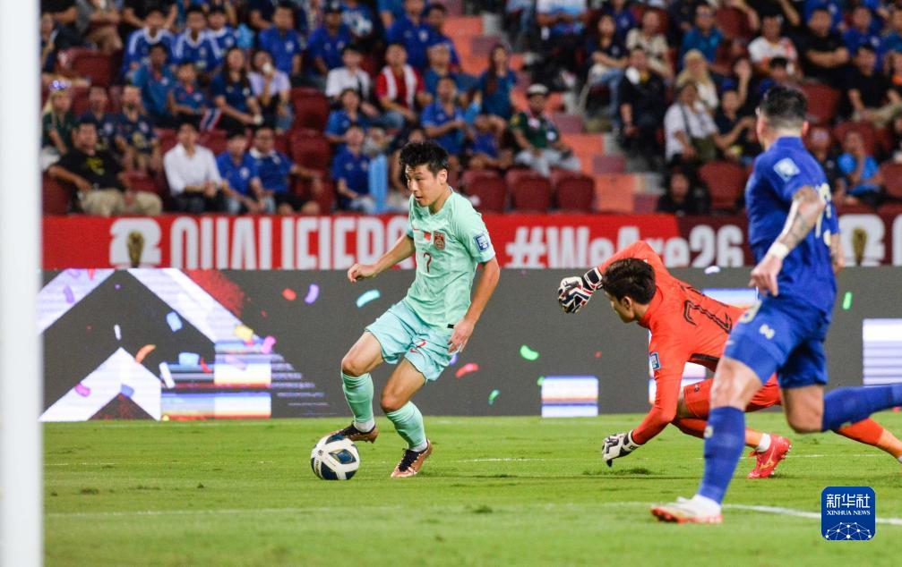 11月16日,中國(guó)隊(duì)球員武磊(左)在比賽中進(jìn)攻。當(dāng)日,在泰國(guó)曼谷舉行的2026世界杯預(yù)選賽亞洲區(qū)36強(qiáng)賽C組比賽中,中國(guó)隊(duì)以2比1戰(zhàn)勝泰國(guó)隊(duì)。新華社發(fā)(拉亨攝)