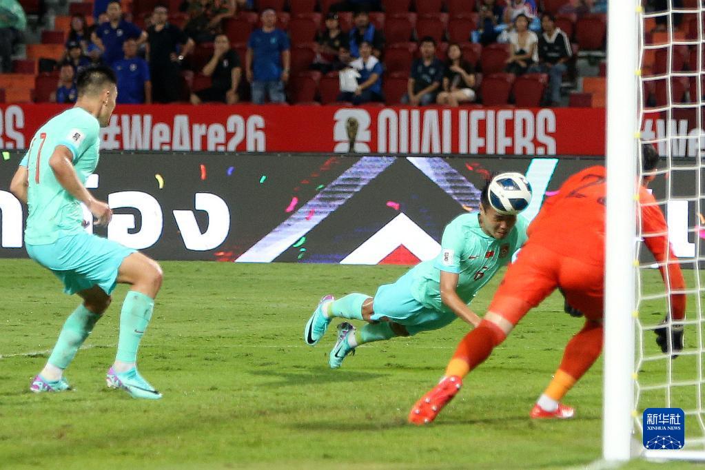 11月16日,中國(guó)隊(duì)球員王上源(中)在比賽中頭球攻門得分。當(dāng)日,在泰國(guó)曼谷舉行的2026世界杯預(yù)選賽亞洲區(qū)36強(qiáng)賽C組比賽中,中國(guó)隊(duì)以2比1戰(zhàn)勝泰國(guó)隊(duì)。新華社記者 王騰 攝