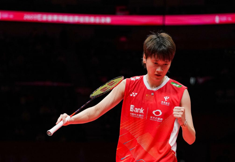 12月14日,陳雨菲在比賽中慶祝得分。新華社記者 孫非 攝