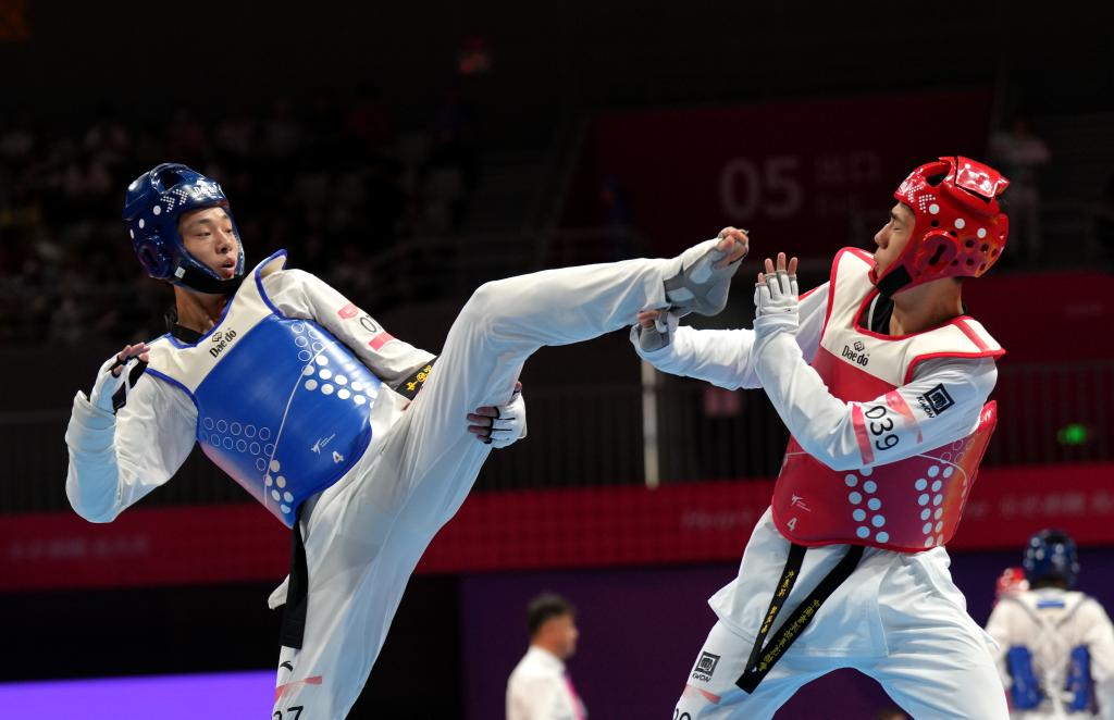 9月27日,杭州亞運會跆拳道男子80公斤級比賽中,崔陽(左)在1/16淘汰賽中戰(zhàn)勝中國香港選手譚政南。新華社記者江文耀攝