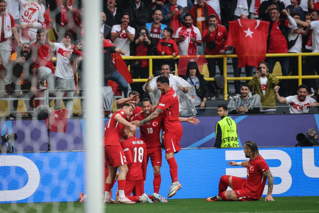 6月18日,土耳其隊(duì)球員梅爾特·穆?tīng)柖艩枺?8號(hào))進(jìn)球后與隊(duì)友慶祝。新華社記者 潘昱龍 攝