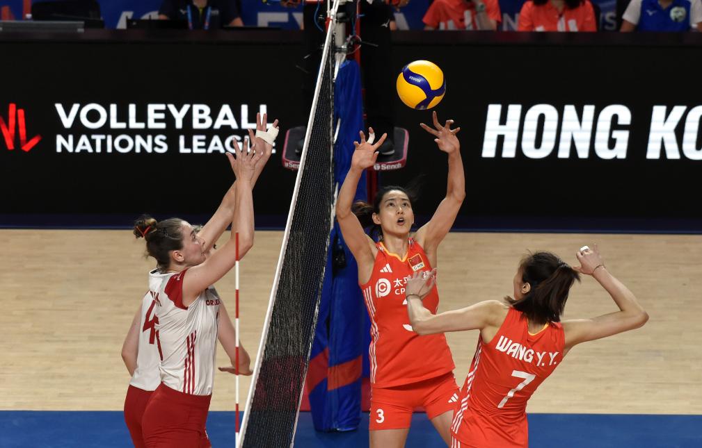 6月14日,中國隊(duì)球員袁心玥(右)在比賽中扣球。當(dāng)日,在世界女排聯(lián)賽中國香港站比賽中,中國隊(duì)3比0戰(zhàn)勝德國隊(duì)。新華社記者 朱煒 攝