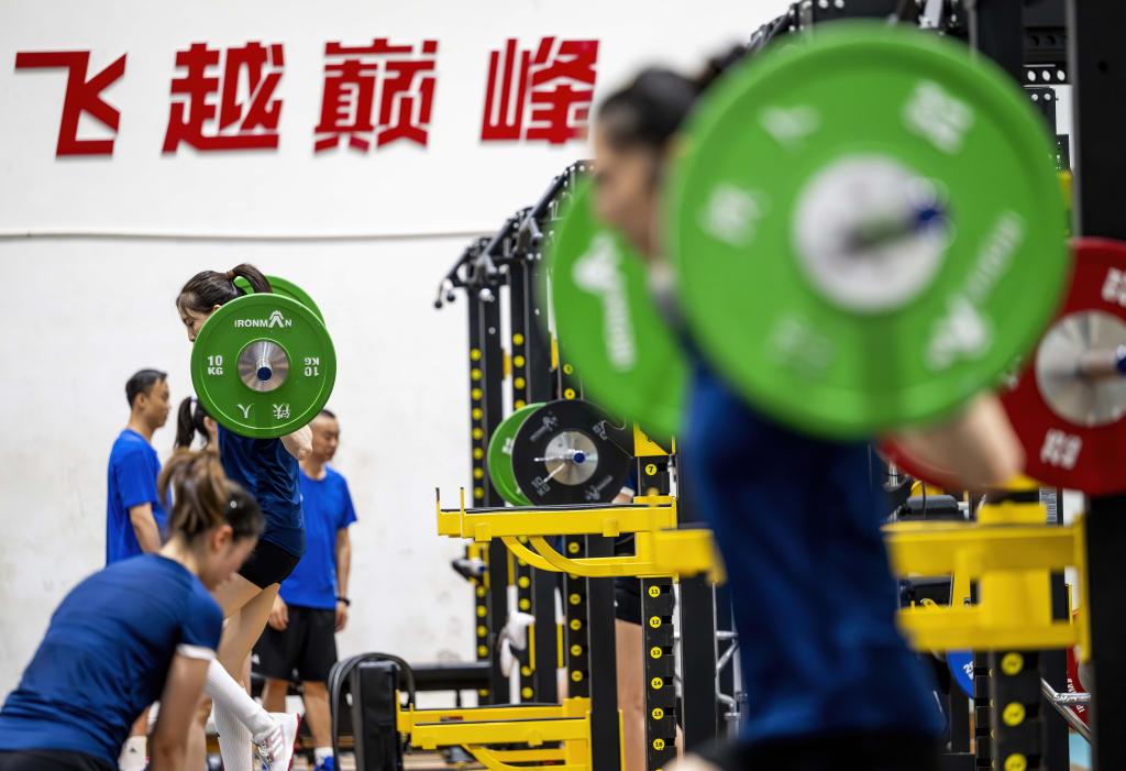 7月13日,中國女排隊(duì)員在進(jìn)行力量訓(xùn)練。新華社記者 魏培全 攝