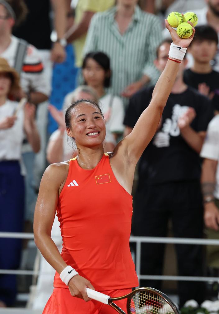 7月31日,鄭欽文慶祝比賽勝利。新華社記者 高靜 攝