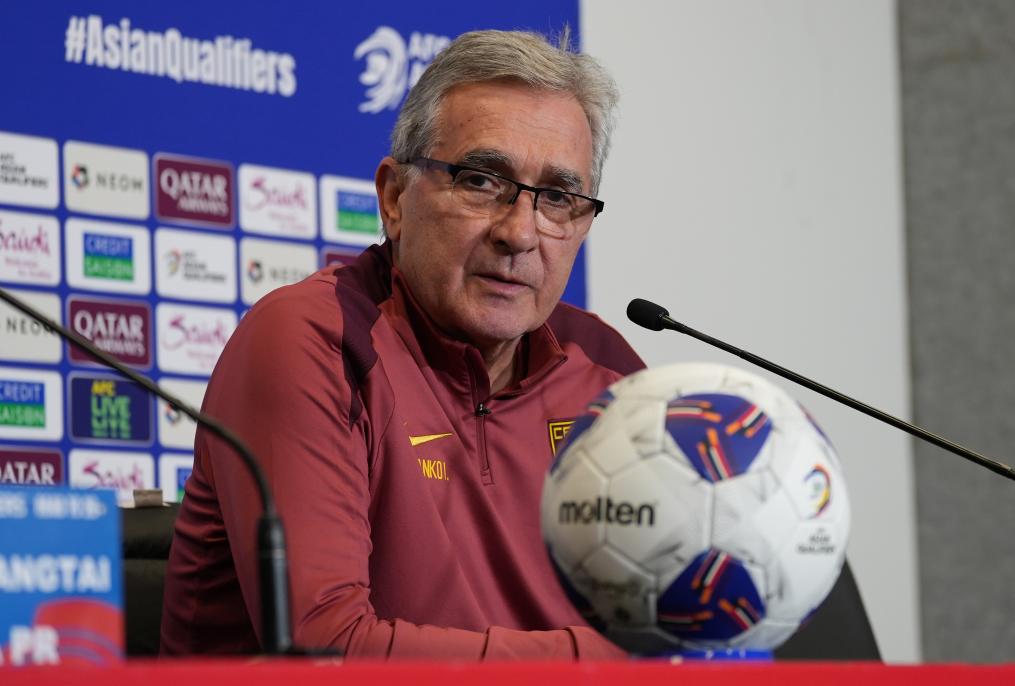 10月9日,中國隊(duì)主教練伊萬科維奇在發(fā)布會上。新華社發(fā)(謝思達(dá) 攝)
