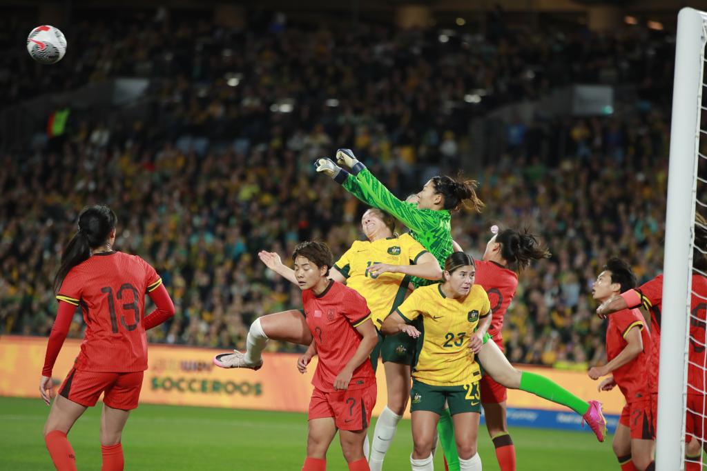6月3日,在澳大利亞悉尼舉行的中澳女足友誼賽中,中國隊(duì)守門員徐歡(上)在比賽中撲救。新華社記者 馬平 攝