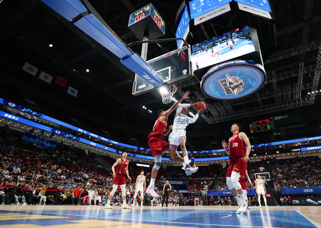 3月14日,在2024-2025賽季中國男子籃球職業(yè)聯(lián)賽(CBA)常規(guī)賽第40輪比賽中,北京北汽隊主場127比92戰(zhàn)勝寧波町渥隊。新華社記者 王楷焱 攝