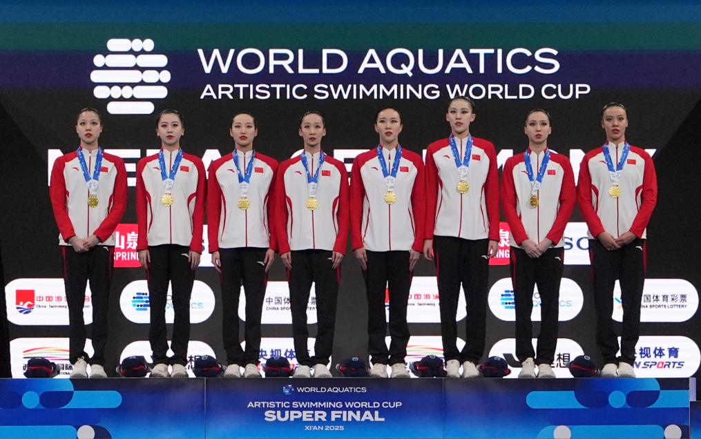 冠軍中國隊(duì)在集體技巧自選決賽頒獎儀式上。15日,在2025年花樣游泳世界杯總決賽集體技巧自選決賽中,中國隊(duì)獲得冠軍。新華社記者 李一博 攝