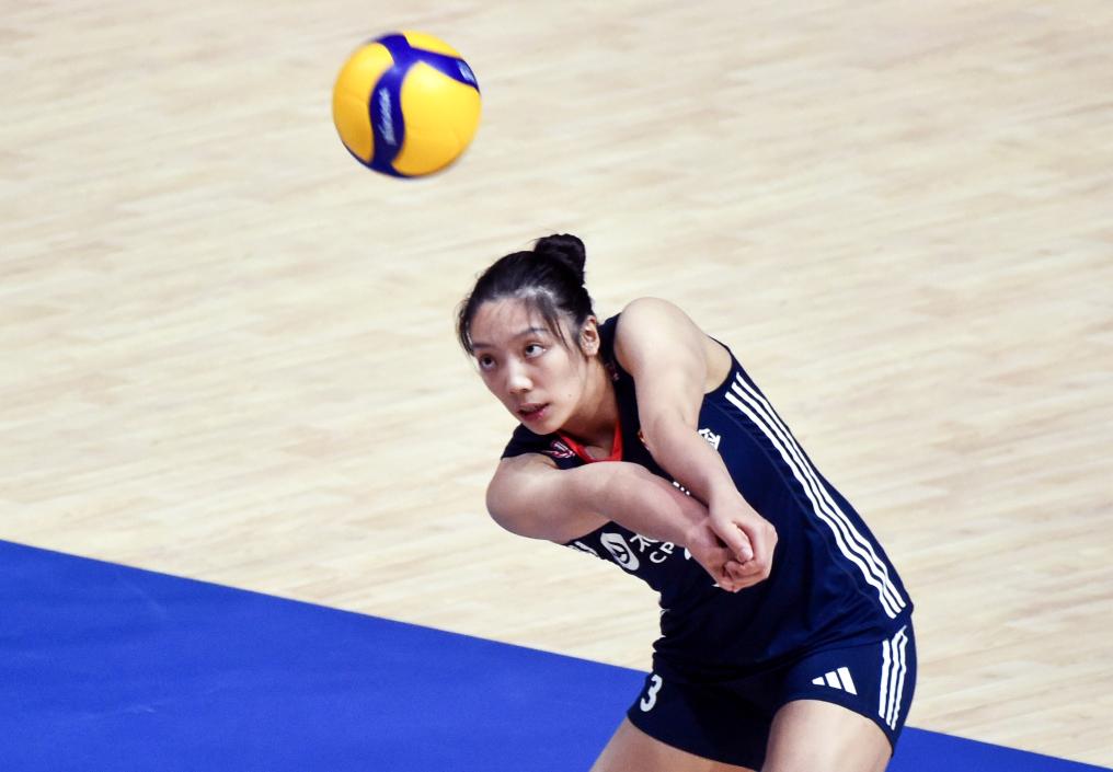 6月22日,中國隊(duì)球員唐欣在比賽中墊球。新華社發(fā)(盧炳輝攝)