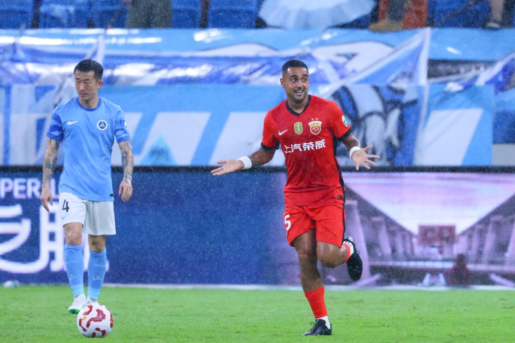 6月30日,上海海港隊球員萊昂納多(右)在比賽中慶祝進(jìn)球。新華社發(fā)(彭志剛 攝)