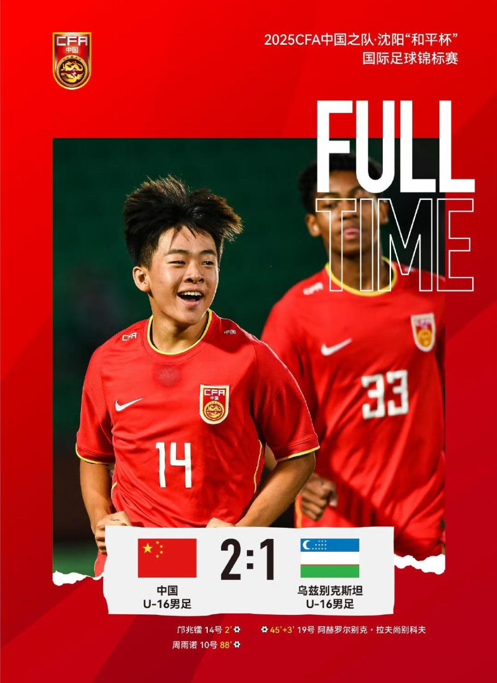 新華社沈陽7月6日電(記者 劉藝淳)6日,2025CFA中國之隊·沈陽“和平杯”國際足球錦標賽次輪在沈陽城市體育場舉行,憑借周雨諾最后時刻的遠射破門,中國U16男足完成“準絕殺”,以2:1力克烏茲別克斯坦隊,保留爭冠希望。