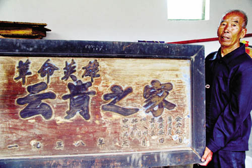 岳云貴的弟弟岳云明展示當(dāng)年縣政府授予的牌匾(潘德華 攝)