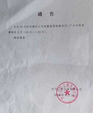 9月19日忻州城區(qū)公交線路按原線路運(yùn)行,廣大市民免費(fèi)乘車5天(19日——23日)。
