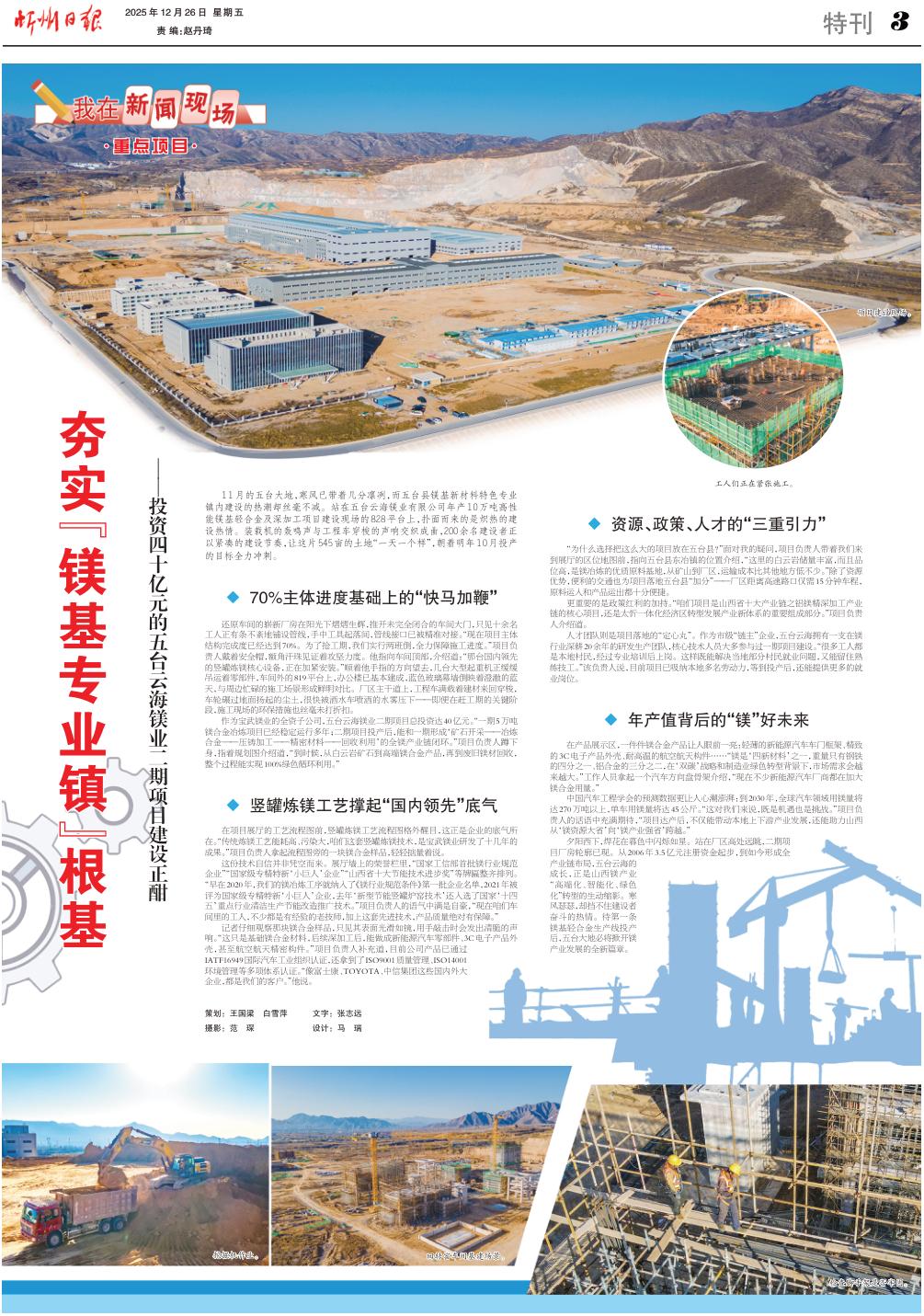 夕陽西下,焊花在暮色中閃爍如星。站在廠區(qū)高處遠(yuǎn)眺,二期項目廠房輪廓已現(xiàn)。從2006年3.5億元注冊資金起步,到如今形成全產(chǎn)業(yè)鏈布局,五臺云海的成長,正是山西鎂產(chǎn)業(yè)“高端化、智能化、綠色化”轉(zhuǎn)型的生動縮影。寒風(fēng)瑟瑟,卻擋不住建設(shè)者奮斗的熱情。待第一條鎂基輕合金生產(chǎn)線投產(chǎn)后,五臺大地必將掀開鎂產(chǎn)業(yè)發(fā)展的全新篇章。