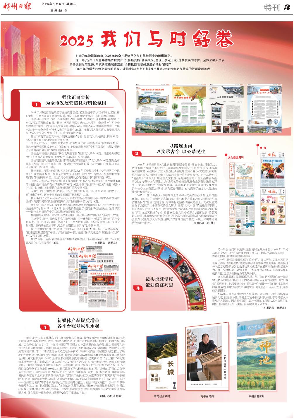 2025年,《忻州晚報(bào)》以濃厚的本土情懷和人文關(guān)懷服務(wù)讀者,全年推出48期。重點(diǎn)專欄“忻州歷史名鎮(zhèn)”深入講述20個(gè)古鎮(zhèn)的故事,同時(shí)新開“探訪魅力村落”欄目,定襄芳蘭、馬城等村的獨(dú)特風(fēng)情躍然紙上。文化報(bào)道貫穿全年,延續(xù)了二十四節(jié)氣的圖文解讀,推動(dòng)“文化中國行”走進(jìn)原平同川、東社等地。在中國人民抗日戰(zhàn)爭暨世界反法西斯戰(zhàn)爭勝利80周年之際,推出“忻州抗戰(zhàn)英模譜”專欄,重溫18位老兵的崢嶸歲月,緬懷先烈,致敬英雄。此外,晚報(bào)積極回應(yīng)社會(huì)關(guān)切,對(duì)中高考政策、流感防護(hù)、供暖保障等社會(huì)焦點(diǎn)、民生熱點(diǎn)及時(shí)報(bào)道,展現(xiàn)了媒體的責(zé)任與溫度,體現(xiàn)出鮮明的地域特色和時(shí)代擔(dān)當(dāng)。(本報(bào)記者劉捷)