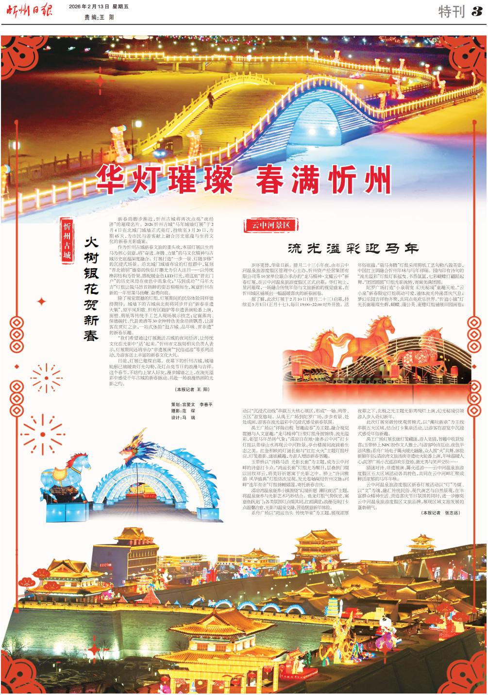 歲序更替,華章日新。臘月二十三小年夜,由市云中河溫泉旅游度假區(qū)管理中心主辦,忻州資產(chǎn)經(jīng)營集團(tuán)有限公司等10家單位聯(lián)合承辦的“龍馬精神·文耀云中”新春燈展,在云中河溫泉旅游度假區(qū)正式啟幕。華燈初上,星河璀璨,一場融合傳統(tǒng)年俗與文旅新韻的視覺盛宴,在忻州城區(qū)鋪展出一幅溫暖喜慶的新春畫卷。