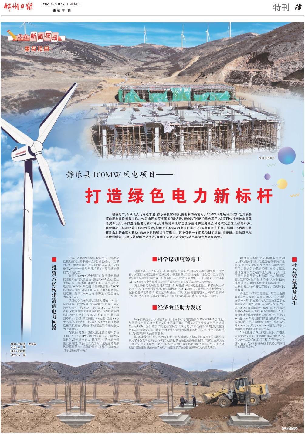 初春時節(jié),晉西北大地寒意未消,靜樂縣杜家村鎮(zhèn)、娑婆鄉(xiāng)的山巒間,100MW風電項目正按計劃開展各項前期與建設(shè)籌備工作。作為山西省落實國家“碳達峰、碳中和”戰(zhàn)略的重點項目,該項目依托當?shù)刎S富風能資源,致力于打造綠色電力新標桿,為建設(shè)晉西北綠色能源基地和經(jīng)濟社會可持續(xù)發(fā)展注入強勁動力。隨著前期工程與統(tǒng)籌工作穩(wěn)步落地,靜樂縣100MW風電項目將在2026年底正式并網(wǎng)。屆時,16臺風機將在晉西北的山巒間轉(zhuǎn)動,源源不斷地輸出清潔電力。這不僅是一個能源項目的建設(shè),更是靜樂縣順應(yīng)氣候條件科學施工、穩(wěn)步轉(zhuǎn)型的生動實踐,表面了該縣正以實際行動書寫綠色發(fā)展新篇章。