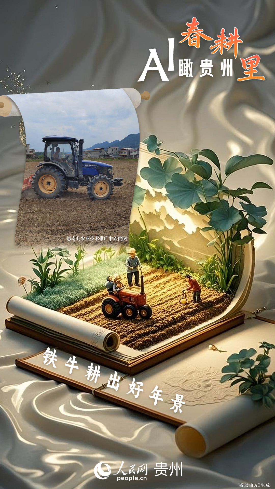 春回大地,萬物復蘇,黔地山川間正上演著一場生機勃勃的春耕盛景。傳統(tǒng)農(nóng)耕與現(xiàn)代科技在這里交織,描繪出一幅幅充滿希望的畫卷。 春耕不僅是農(nóng)時的序曲,更是科技與土地對話的現(xiàn)場。在貴州這片喀斯特地貌與民族文化交織的土地上,春耕正經(jīng)歷一場靜默的變革:無人機掠過千年梯田,算法解析紅壤墑情,覆膜機織就“智能外衣”,而彎腰勞作的農(nóng)人,依然用繭手傳遞著古老農(nóng)耕文明的溫度。 本期跟隨AI一起描繪貴州春耕里的故事。