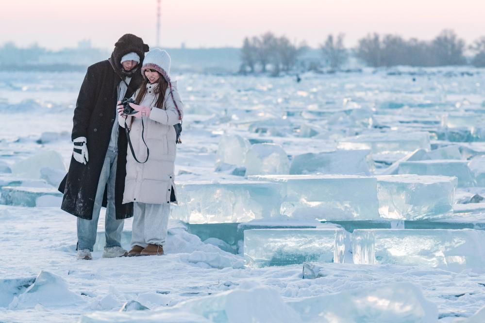 1月7日,在封凍的松花江哈爾濱段,游客在“鉆石海”游玩。新華社記者謝劍飛攝