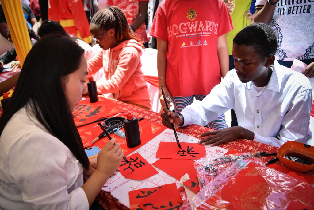 2月10日,在肯尼亞首都內(nèi)羅畢,人們在內(nèi)羅畢中國春節(jié)廟會上體驗中國書法。(新華社記者韓旭 攝)