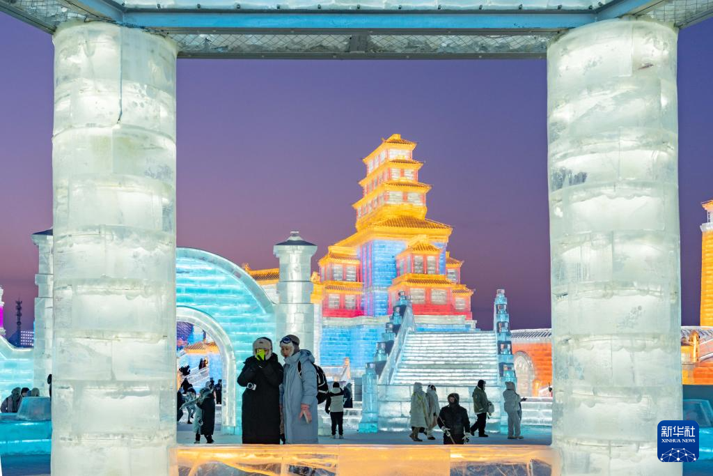 游客在哈爾濱冰雪大世界園區(qū)內(nèi)游玩(1月5日攝)。新華社記者 謝劍飛 攝