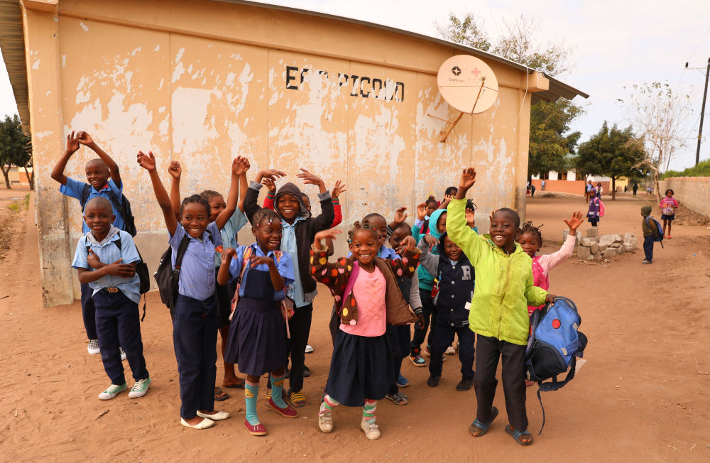 2023年7月25日,莫桑比克馬普托省皮科科村學(xué)校的孩子們站在裝有中國援助的衛(wèi)星電視接收天線的房屋前?!叭f村通”項(xiàng)目旨在為非洲國家的1萬個(gè)村莊接入衛(wèi)星數(shù)字電視信號(hào),項(xiàng)目2018年在莫桑比克啟動(dòng),為該國1000個(gè)村落、2萬戶家庭和3000個(gè)公共場所安裝衛(wèi)星電視設(shè)備,提供電視信號(hào)和節(jié)目,覆蓋農(nóng)村人口達(dá)250萬。新華社記者 董江輝 攝