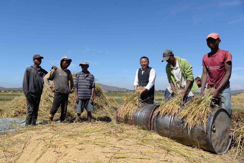 在馬達(dá)加斯加首都塔那那利佛附近的馬義奇鎮(zhèn),中國雜交水稻技術(shù)專家胡月舫(右三)在中國國家雜交水稻工程技術(shù)研究中心非洲分中心的試驗(yàn)田里和當(dāng)?shù)剞r(nóng)民一起收獲水稻(2023年5月12日攝)。新華社發(fā)(西塔卡·拉喬納里松 攝)