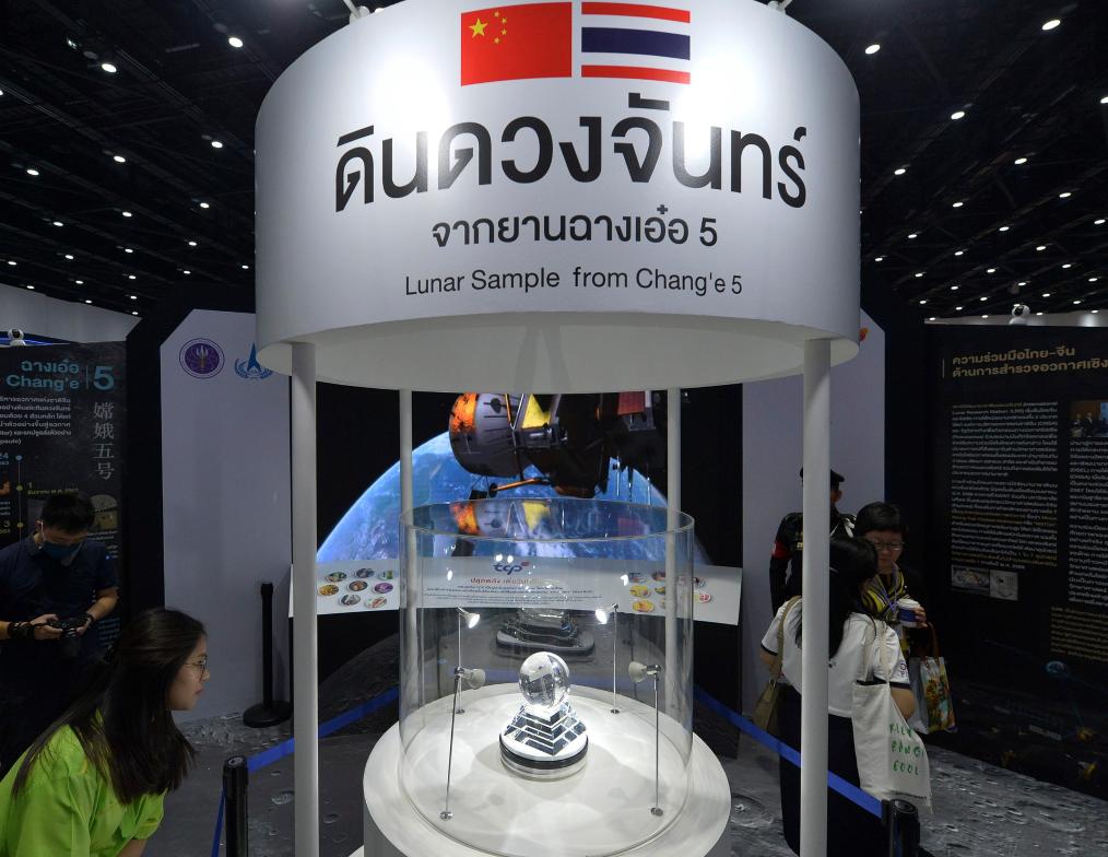 這是2024年7月23日在泰國(guó)曼谷舉行的“2024泰國(guó)未來(lái)科學(xué)力量展覽會(huì)”上拍攝的嫦娥五號(hào)月壤樣品展臺(tái)。新華社發(fā)(拉亨 攝)