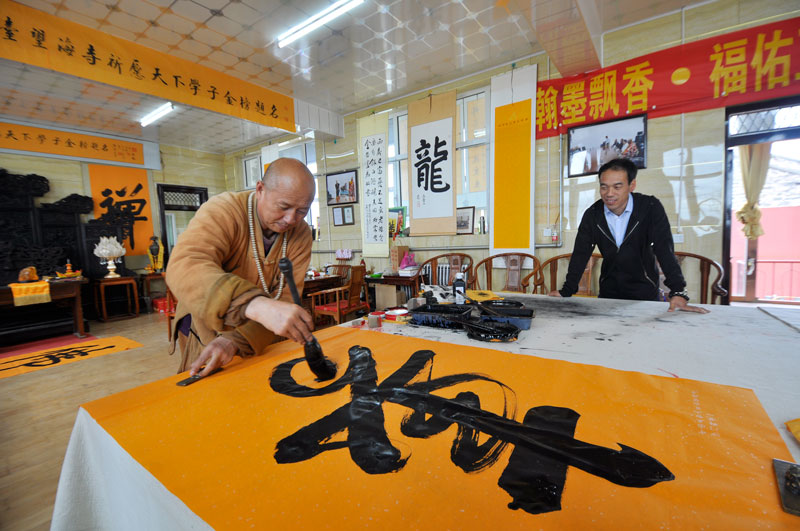 29日,中國(guó)佛教講經(jīng)交流會(huì)在五臺(tái)山召開(kāi)之際,記者走訪(fǎng)了東臺(tái)頂望海寺釋覺(jué)一法師,他在勤修佛法的同時(shí)在書(shū)畫(huà)藝術(shù)上也自成一家。他認(rèn)為,佛法與書(shū)畫(huà)關(guān)系密切相通之處,學(xué)習(xí)佛法可促進(jìn)書(shū)法境界的提升,有助于佛法的弘揚(yáng)。