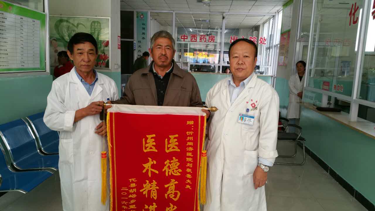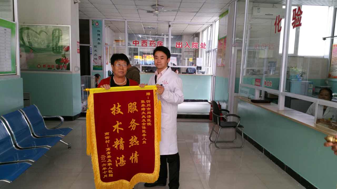 “謝謝您!張大夫,我現(xiàn)在精神好多了,睡眠也好了,吃飯也有胃口了……真是不知道怎樣感謝您才好?!?0月8日,位于忻州市光明西街的同濟(jì)醫(yī)院辦公室,高老先生夫婦握著張大夫的手激動(dòng)地說(shuō)。其妻子郝女士將早已準(zhǔn)備好的一面“服務(wù)熱情,醫(yī)術(shù)精湛”的錦旗送到張成喜大夫手中。同樣來(lái)自代縣胡峪鄉(xiāng)的賈先生也將一面寫(xiě)有“醫(yī)德高尚,醫(yī)術(shù)精湛”的錦旗送到了該院寧院長(zhǎng)手中。
