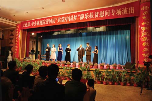 日前,文化部、中央歌劇院在靜樂縣舉辦了迎國慶“共筑中國夢(mèng)”扶貧慰問專場演出。中央歌劇院的藝術(shù)家與當(dāng)?shù)馗刹咳罕娡_(tái)獻(xiàn)藝,共同重溫紅色經(jīng)典,熱情謳歌黨的光輝業(yè)績。整場演出薈萃眾多藝術(shù)名家,演員們激情演唱了《我們走在大路上》《我為祖國獻(xiàn)石油》《打起手鼓唱起歌》《草原上升起不落的太陽》等膾炙人口的經(jīng)典老歌,引起了觀眾強(qiáng)烈的共鳴,現(xiàn)場掌聲、歡呼聲、叫好聲連綿不斷。演出不僅給當(dāng)?shù)厝罕妿硪粓鼍始姵实奈幕⒀?,也激?lì)了干群齊心協(xié)力打好脫貧攻堅(jiān)戰(zhàn)的斗志,增強(qiáng)了百姓實(shí)現(xiàn)全面脫貧、全面小康的信心和決心。(小敏 攝)