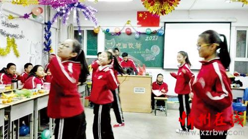 聯(lián)歡會由各班學生自己精心組織、排練,并由學生自主開展。同學們熱情高漲,積極參與,充分發(fā)揮自己的特長,表演自己最拿手的節(jié)目。每位同學都積極參與,每個人都成了“明星大腕”。班級聯(lián)歡會內(nèi)容豐富、精彩紛呈,舞蹈、歌曲、相聲、小品、游戲等節(jié)目一一亮相,喜慶祥和的氛圍濃厚強烈。圖為初二210班學生正在進行節(jié)目表演。(郝江峰 攝)