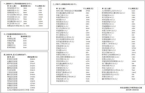 自2018年12月10日市委、市政府辦公廳發(fā)出《關(guān)于開(kāi)展“送溫暖、獻(xiàn)愛(ài)心”社會(huì)捐助活動(dòng)的通知》(忻辦字【2018】86號(hào))以來(lái),市四大班子領(lǐng)導(dǎo)率先垂范,各縣(市、區(qū))、各單位高度重視,緊急部署,廣大干部職工積極響應(yīng),踴躍捐款,又一次掀起了“送溫暖、獻(xiàn)愛(ài)心”社會(huì)捐助活動(dòng)的高潮。截至2019年4月25日下午4時(shí),全市累計(jì)接收捐款2802113元,其中市直79個(gè)單位組織參加了此次捐助活動(dòng),共計(jì)捐款585095元;各縣(市、區(qū))接收捐款2217018元,為解決我市困難群眾的生產(chǎn)、生活問(wèn)題,助推脫貧攻堅(jiān)起到了積極的作用?,F(xiàn)將活動(dòng)進(jìn)展情況公告如下(市直單位以捐助時(shí)間先后為序):