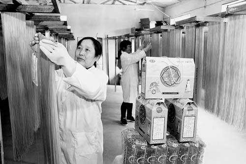 7月20日,工人正在晾曬生產(chǎn)出的“河撈面”。始制于北宋年間的五臺(tái)縣民間美食“河撈面”,如今又被該縣豆村鎮(zhèn)列為產(chǎn)業(yè)扶貧項(xiàng)目。在當(dāng)?shù)兀粋€(gè)由興坪村“霞輝”玉米加工專業(yè)合作社生產(chǎn)出的玉米、高粱、蕎麥、大豆等12類盒裝與袋裝產(chǎn)品,已俏銷太原、忻州等食品市場(chǎng),年產(chǎn)值達(dá)56萬元。(金俊賢 攝)