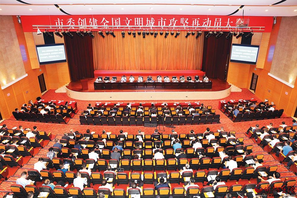 市委創(chuàng)建全國文明城市攻堅再動員大會會場。范濤 攝