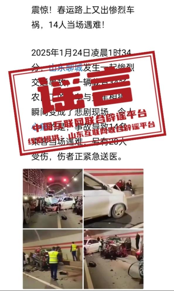 真相:近日,有網(wǎng)民在網(wǎng)絡(luò)平臺發(fā)布一則“山東聊城一隧道內(nèi)發(fā)生多車相撞”的信息,稱“現(xiàn)場多車發(fā)生嚴(yán)重碰撞,場面慘烈,群眾滯留”,引發(fā)關(guān)注。經(jīng)當(dāng)?shù)鼐胶藢?,山東省聊城市從未發(fā)生過類似交通事故,該信息內(nèi)容純屬虛假編造。經(jīng)查,網(wǎng)民褚某某和韓某為博取關(guān)注、吸引流量,將外省市發(fā)生交通事故的圖片視頻移花接木,稱“聊城發(fā)生交通事故”并憑空捏造傷亡人數(shù),造成不良影響。目前,二人已被公安機關(guān)依法打擊處理。(來源:山東互聯(lián)網(wǎng)聯(lián)合辟謠平臺、聊城市網(wǎng)上辟謠平臺)