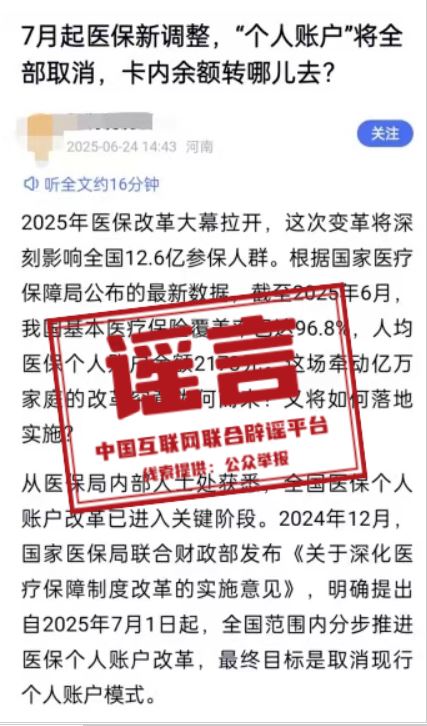 詳情:近日,一篇題為《7月起醫(yī)保新調整,“個人賬戶”將全部取消,卡內余額轉哪里去?》的自媒體文章引起較多關注。文中宣稱“從醫(yī)保局內部人士處獲悉,全國醫(yī)保個人賬戶改革已進入關鍵階段”“自2025年7月1日起,全國范圍內分步推進醫(yī)保個人賬戶改革,最終目標是取消現行個人賬戶模式”。