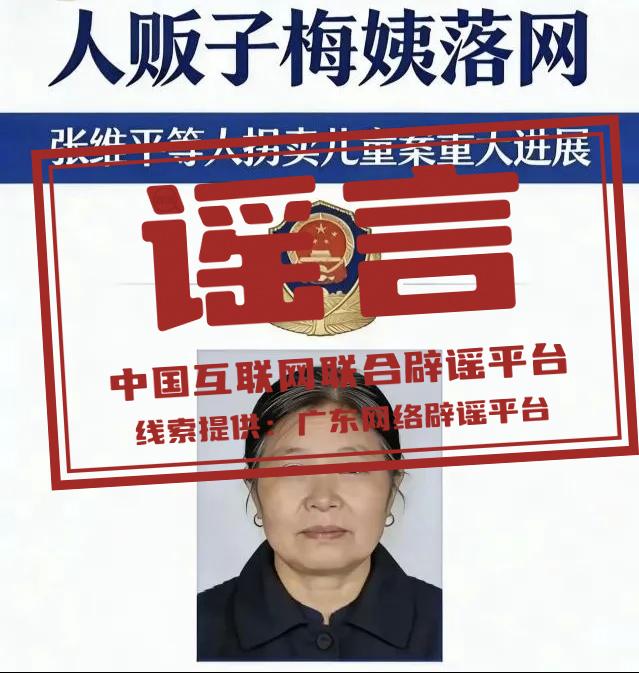 詳情:近日,廣州警方宣布“張維平拐賣(mài)兒童案”關(guān)鍵人物“梅姨”(謝某某)落網(wǎng)。不久后,一張標(biāo)有警徽、配著所謂落網(wǎng)“梅姨”照片的圖片在網(wǎng)絡(luò)流傳。經(jīng)核查,該網(wǎng)傳圖片并非警方發(fā)布,所謂的“梅姨”照片為虛假照片。