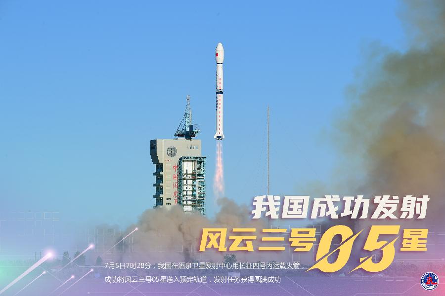 7月5日7時(shí)28分,我國在酒泉衛(wèi)星發(fā)射中心用長(zhǎng)征四號(hào)丙運(yùn)載火箭,成功將風(fēng)云三號(hào)05星送入預(yù)定軌道,發(fā)射任務(wù)獲得圓滿成功。新華社發(fā)(汪江波 攝)