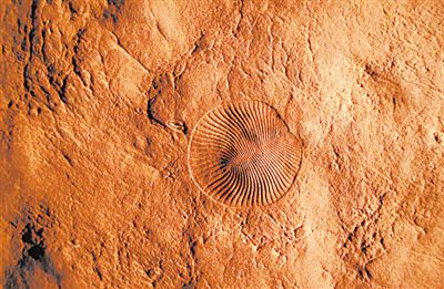 南澳大利亞尼佩納·埃迪卡拉國家公園砂巖中的埃迪卡拉紀化石狄更遜水母(中)與較小的錨形帕文柯利納蟲(左)的圖像。圖片來源:斯科特·埃文斯