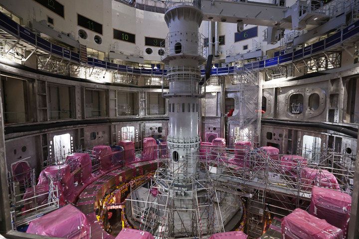 這是11月23日在位于法國圣保羅-萊迪朗斯的國際熱核聚變實驗反應堆(ITER)建設現(xiàn)場拍攝的安裝中的托卡馬克裝置。(梁希之 攝)