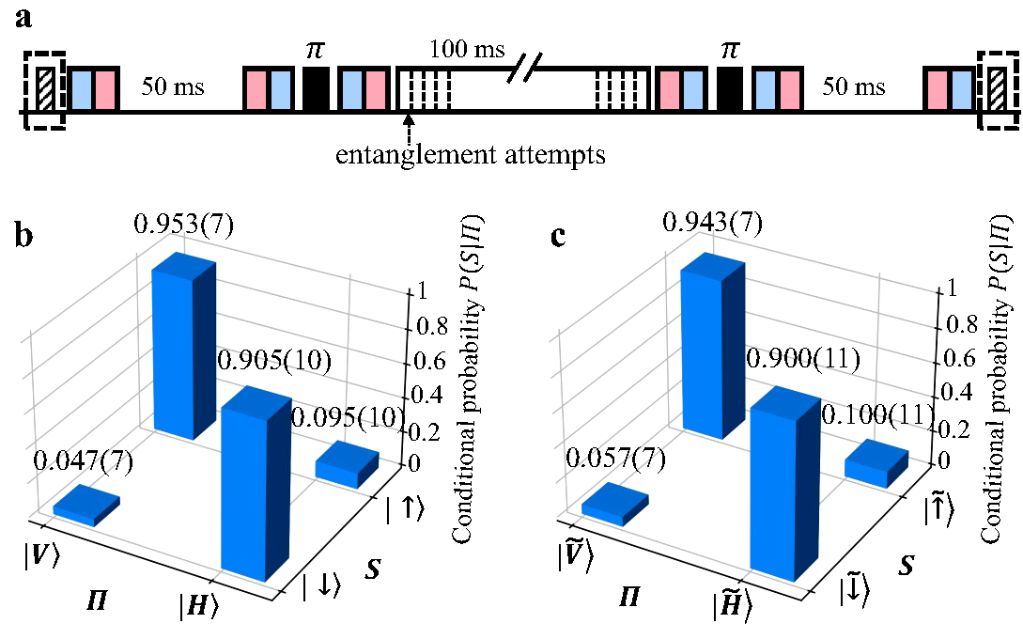 實(shí)驗(yàn)發(fā)現(xiàn),通過此方法制備出的通訊比特,可在數(shù)百毫秒的時(shí)間內(nèi)生成離子-光子糾纏;通過自旋回波方法可延長(zhǎng)存儲(chǔ)比特的存儲(chǔ)壽命,實(shí)現(xiàn)相干時(shí)間達(dá)到秒量級(jí)的存儲(chǔ)量子比特。通過比較有無(wú)離子-光子糾纏生成操作時(shí)存儲(chǔ)比特的保真度變化,研究人員證實(shí)了兩種量子比特之間低于實(shí)驗(yàn)精度的串?dāng)_誤差,從而實(shí)現(xiàn)了無(wú)串?dāng)_的量子網(wǎng)絡(luò)節(jié)點(diǎn)。