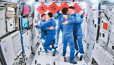 4月26日在軌執(zhí)行任務(wù)的神舟十七號(hào)航天員乘組順利打開(kāi)“家門”,歡迎遠(yuǎn)道而來(lái)的神舟十八號(hào)航天員乘組入駐“天宮”。新華社記者 金良快攝