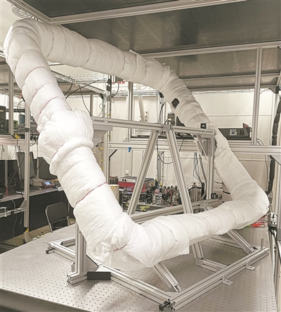 薩格納克干涉儀2公里長(zhǎng)的光纖纏繞在邊長(zhǎng)1.4米的方形鋁制框架上。圖片來(lái)源:奧地利維也納大學(xué)