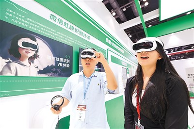 隨著數(shù)字金融領(lǐng)域創(chuàng)新成果不斷投入應(yīng)用,刷掌支付、虹膜識別支付等支付手段逐步走進居民生活。圖為觀眾在2024中國國際金融展上通過虛擬現(xiàn)實設(shè)備體驗微信虹膜識別技術(shù)。陳曉根攝(人民視覺)