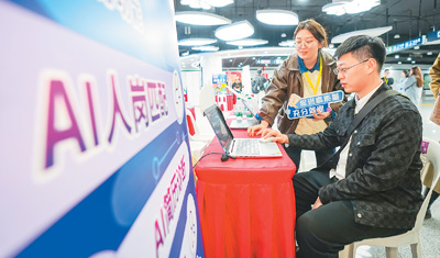 日前,在福建省福州市鼓樓區(qū)安泰街道南門兜地鐵站里舉行的2025年就業(yè)援助月專項(xiàng)活動(dòng)中,工作人員利用AI技術(shù)和大數(shù)據(jù)分析等先進(jìn)技術(shù),為求職者提供智能化的崗位匹配和職業(yè)規(guī)劃建議。謝貴明攝(人民視覺(jué))